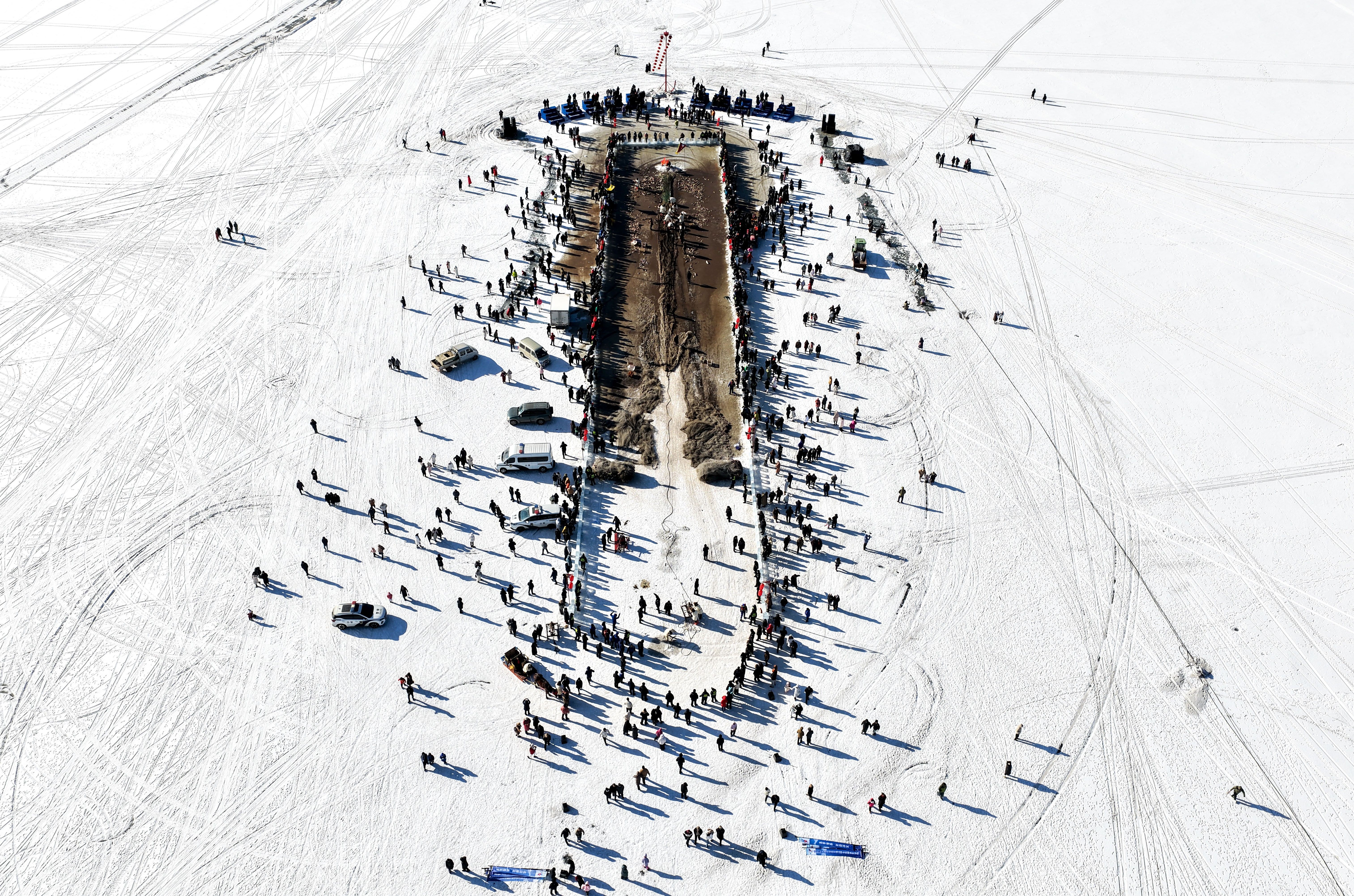 1月10日,市民和游客在冰面上观看冬捕(无人机照片)。新华社记者 连振 摄
