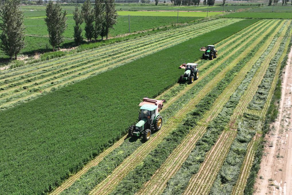 巴彦淖尔市磴口县紫花苜蓿种植基地收割苜蓿。新华社记者李云平 摄